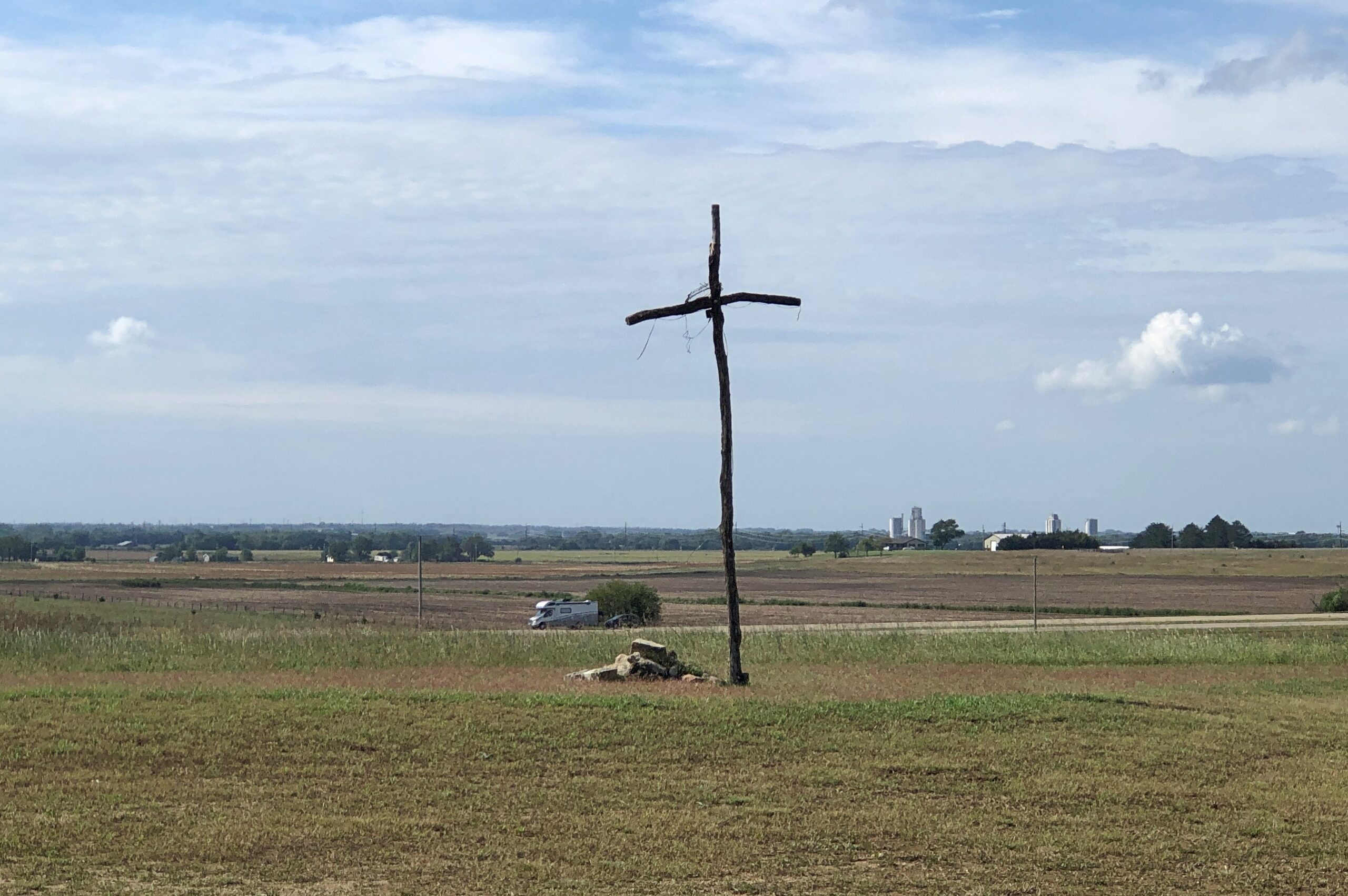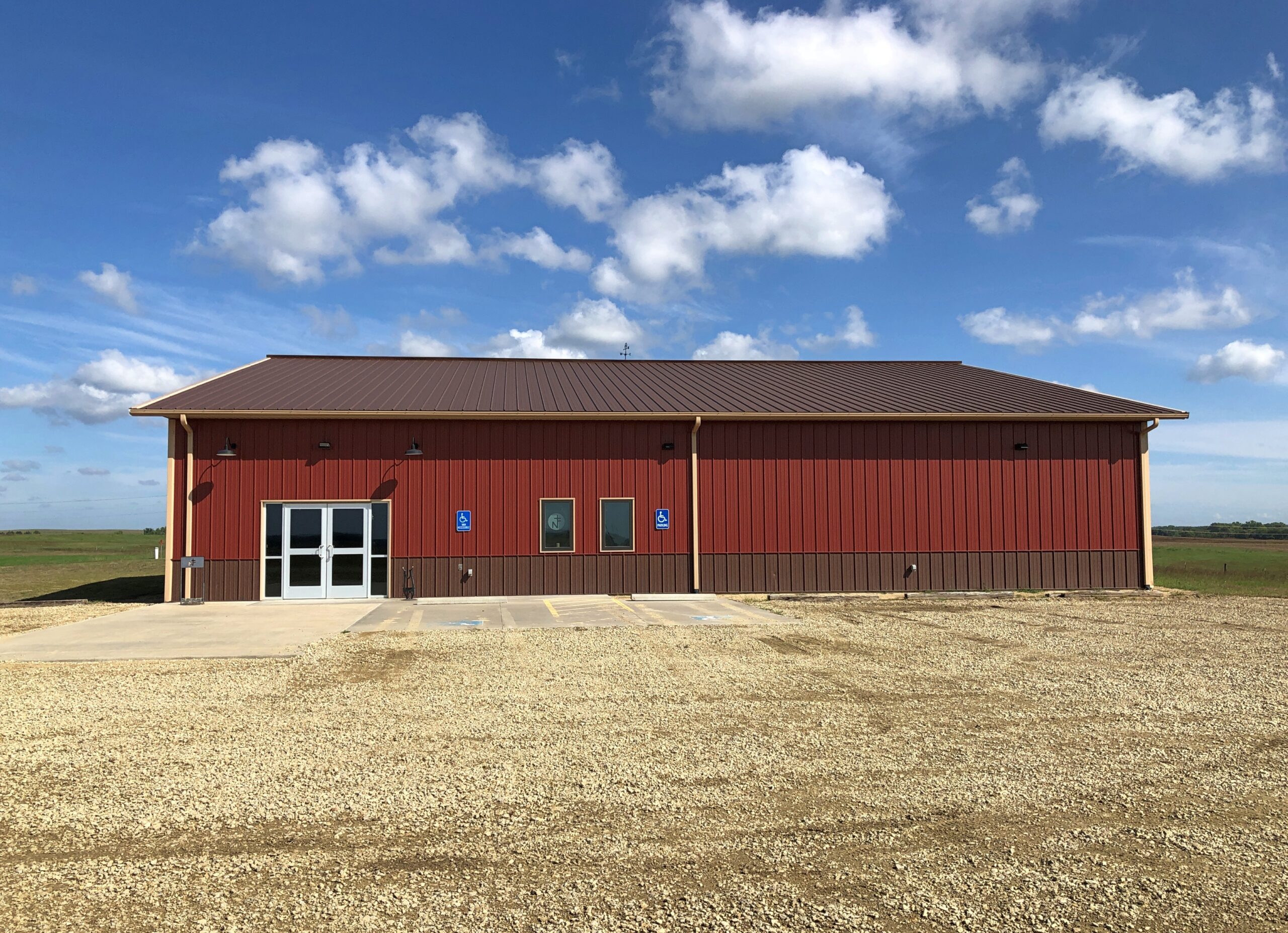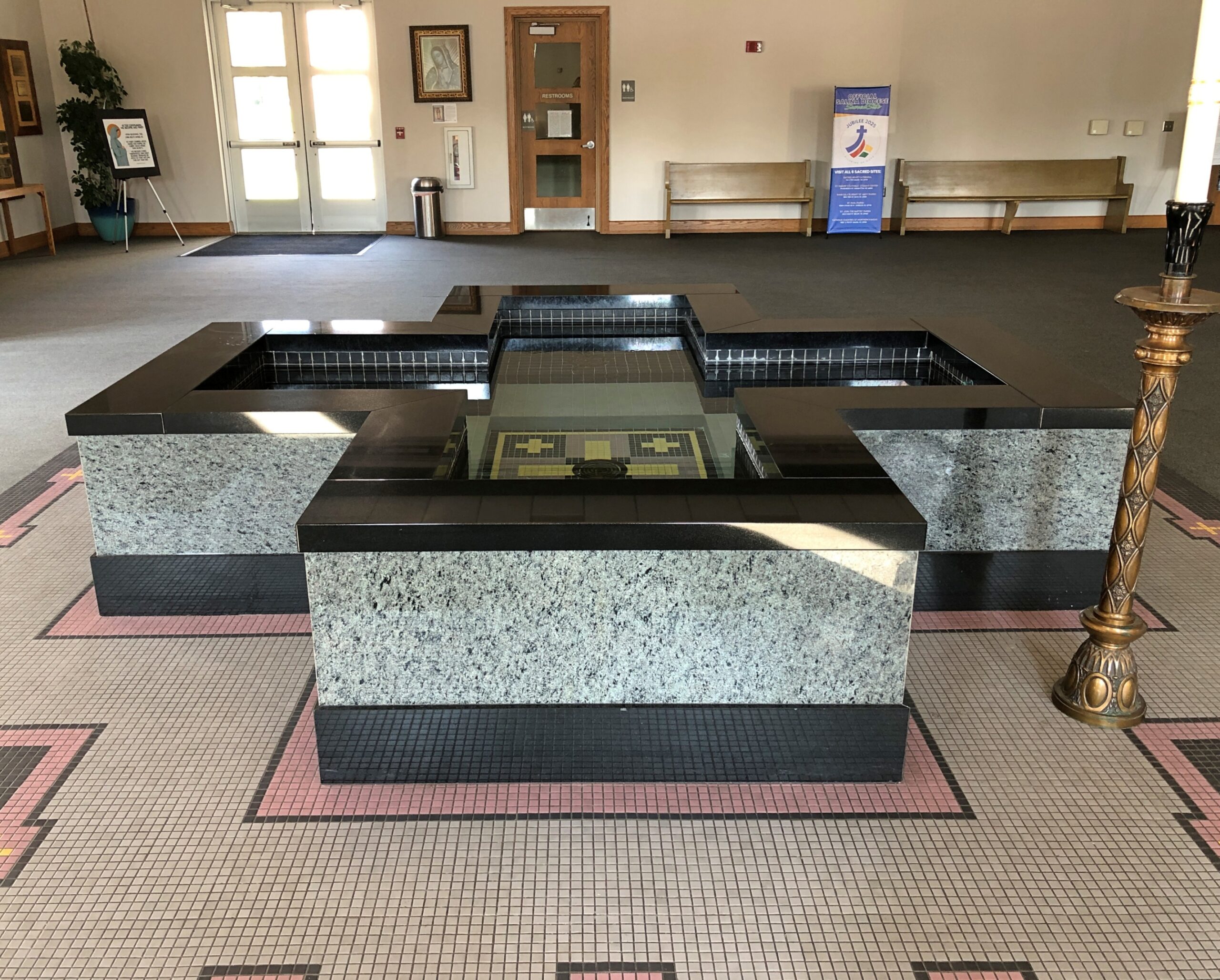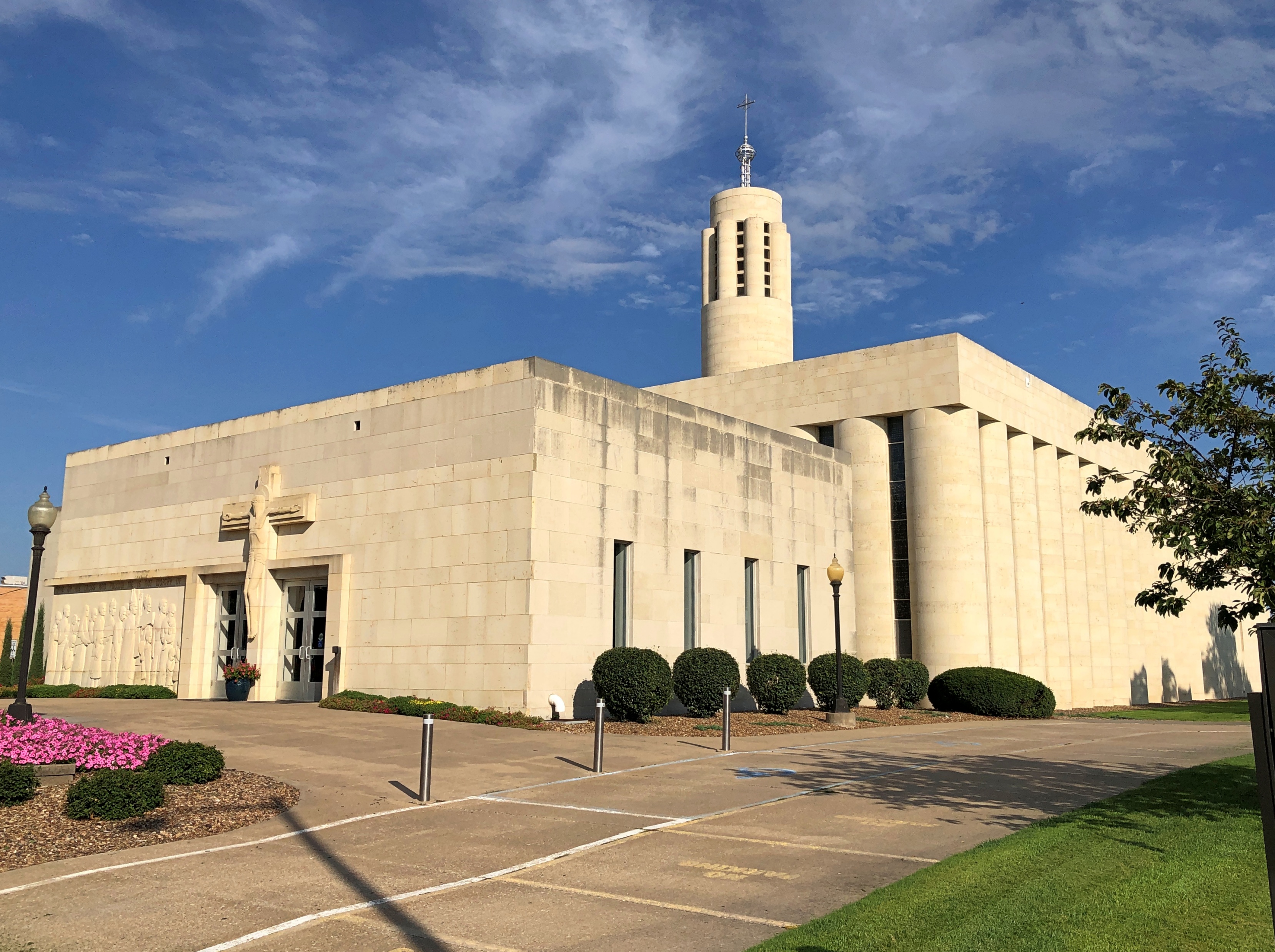 A hallway and some rooms extend beyond the front of the nave, including a columbarium.