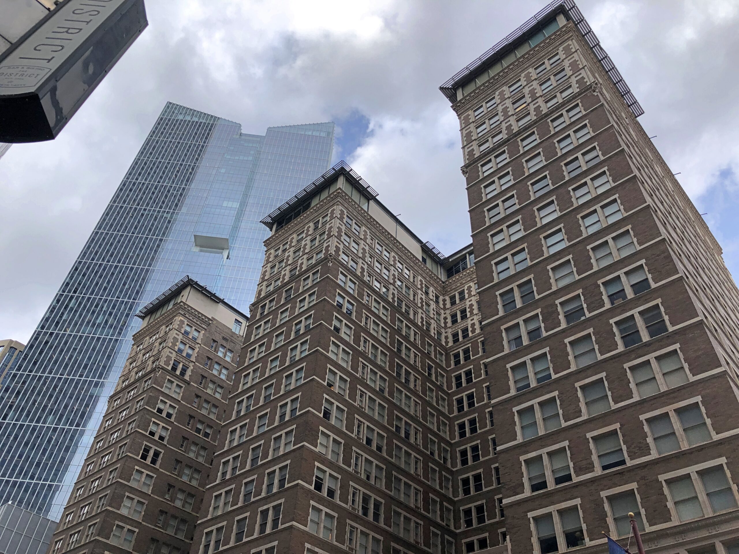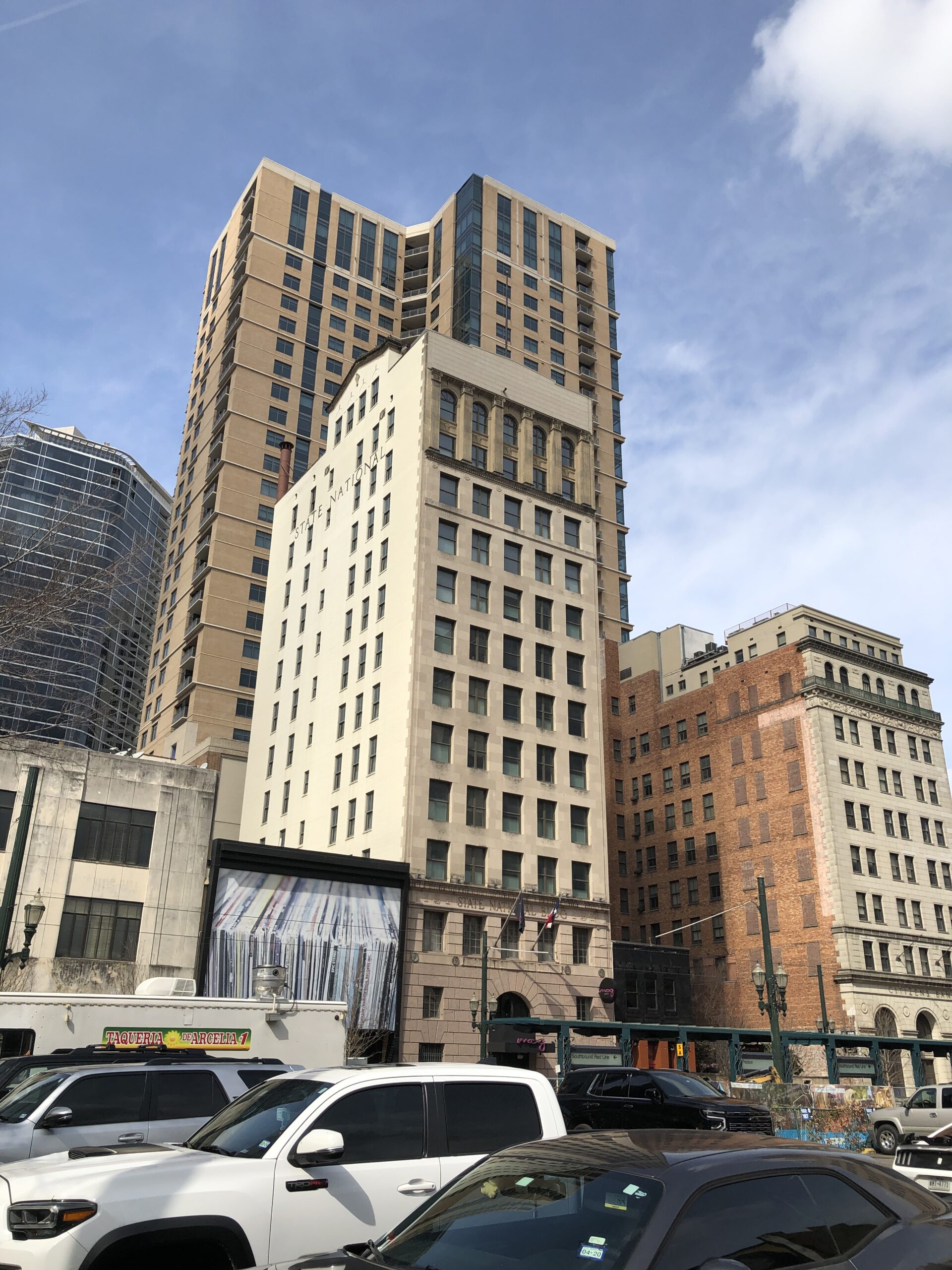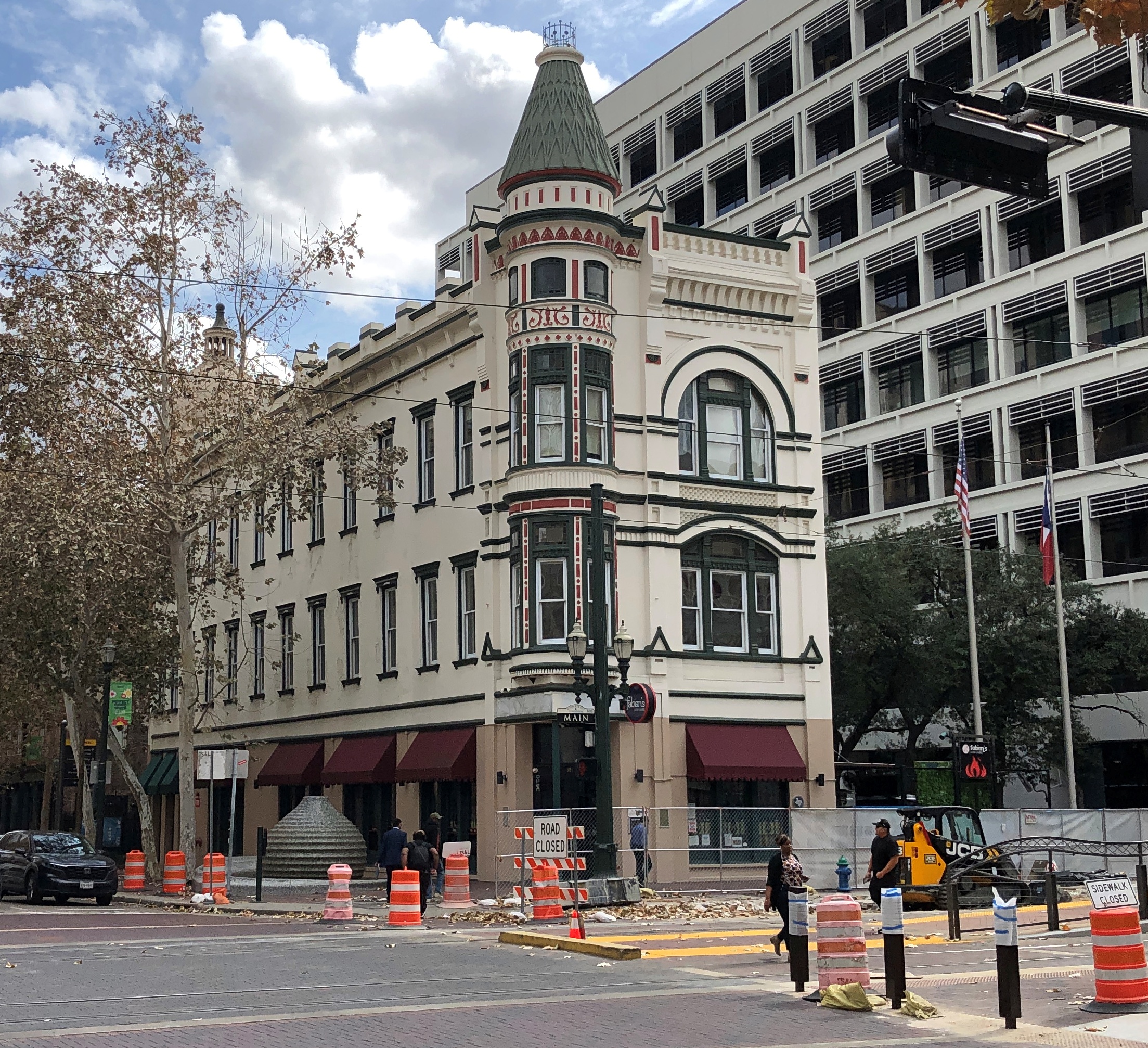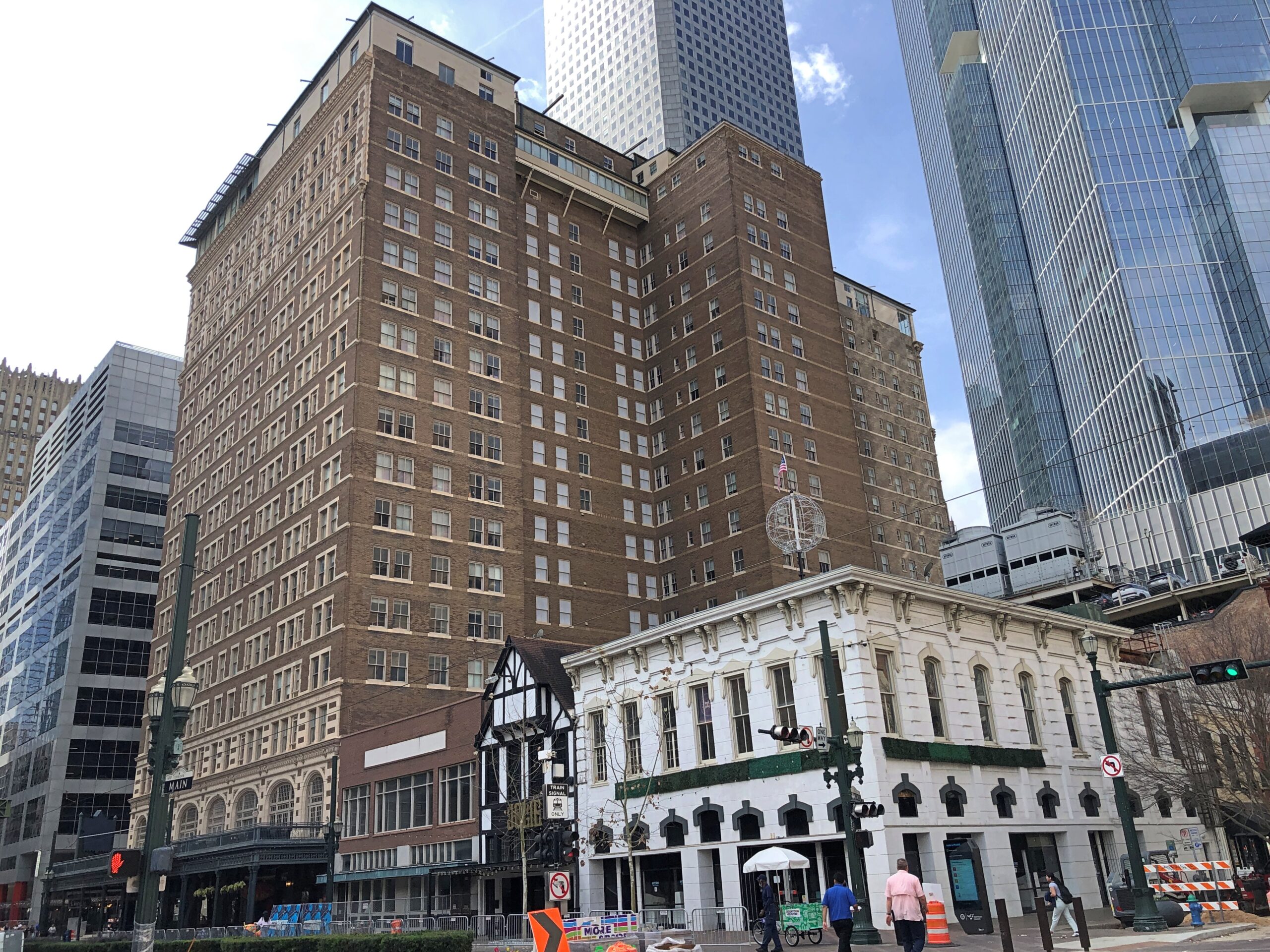 The splendid former Rice Hotel, designed by John Mauran and completed in 1913, though it only had two towers at the time, becoming triune with a later addition. These days, it’s an apartment building.