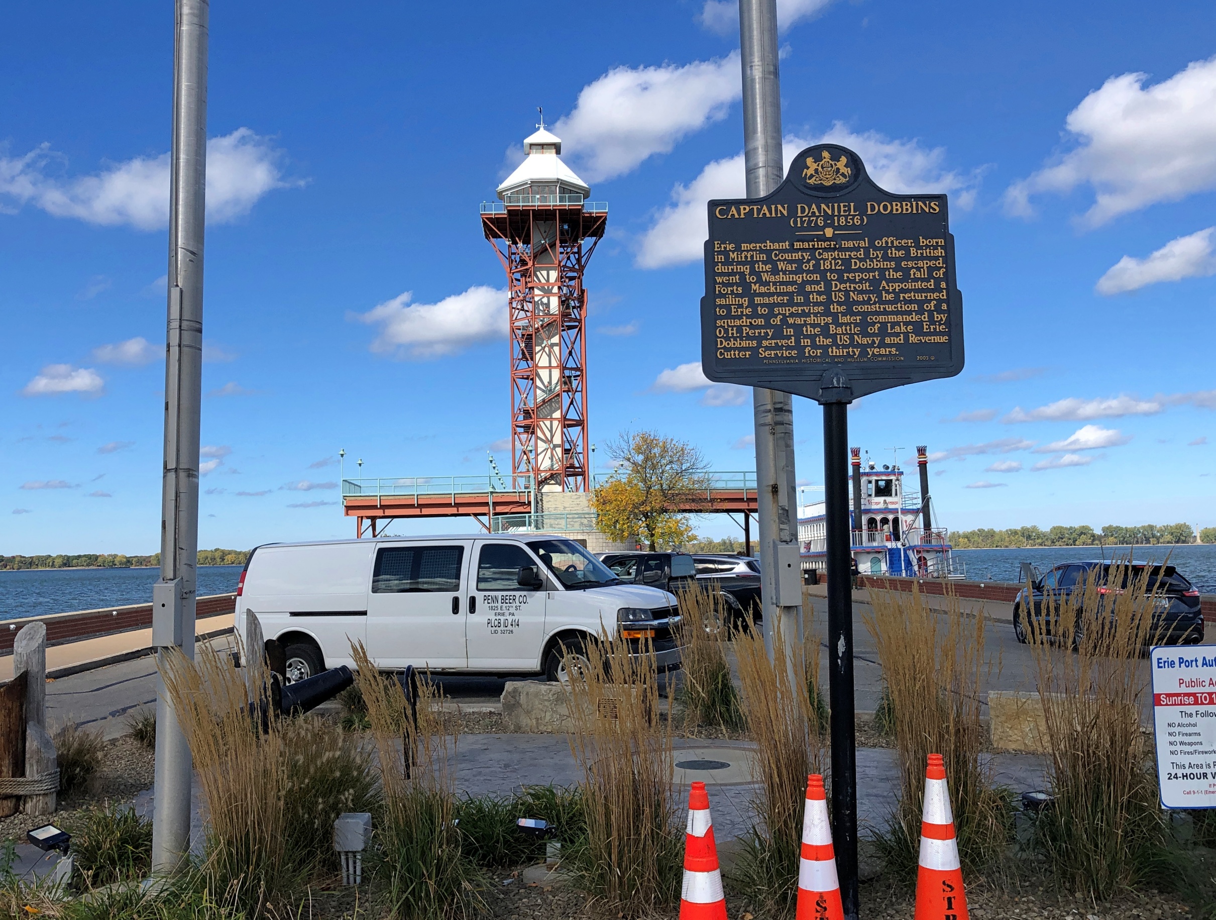 Built not for the U.S. bicentennial that we all remember so – fondly, but rather the 200th anniversary of the city of Erie, about 20 years later. Regardless, I was looking forward to the vista: the city, the bay and Presque Isle State Park. But no. Closed. Even so, I got a good look at the area, including the tower but also the U.S. Brig Niagara, which was instrumental in Oliver Hazard Perry winning immortal fame. Or would have been, if the Battle of Lake Erie were taught in schools any more.