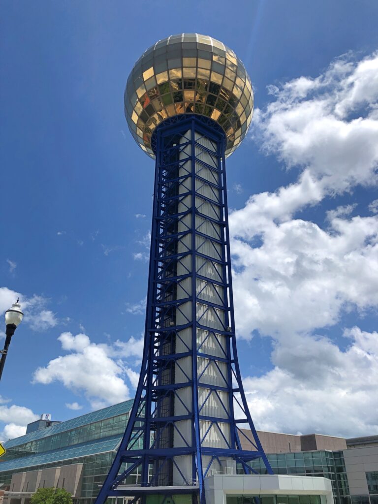 I’d come that day, passing through Knoxville from Nashville and en route to Charlotte, not just to see the Sunsphere exterior, but to ride the elevator to its observation deck and take in the view, roughly 300 feet up. I’d blown off seeing the fair 40+ years ago, but I wasn’t going to miss its shiny legacy on this trip if I could help it.