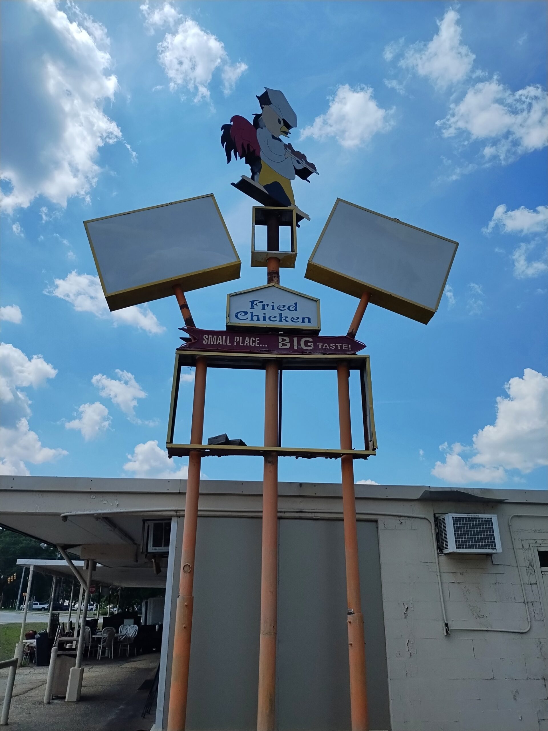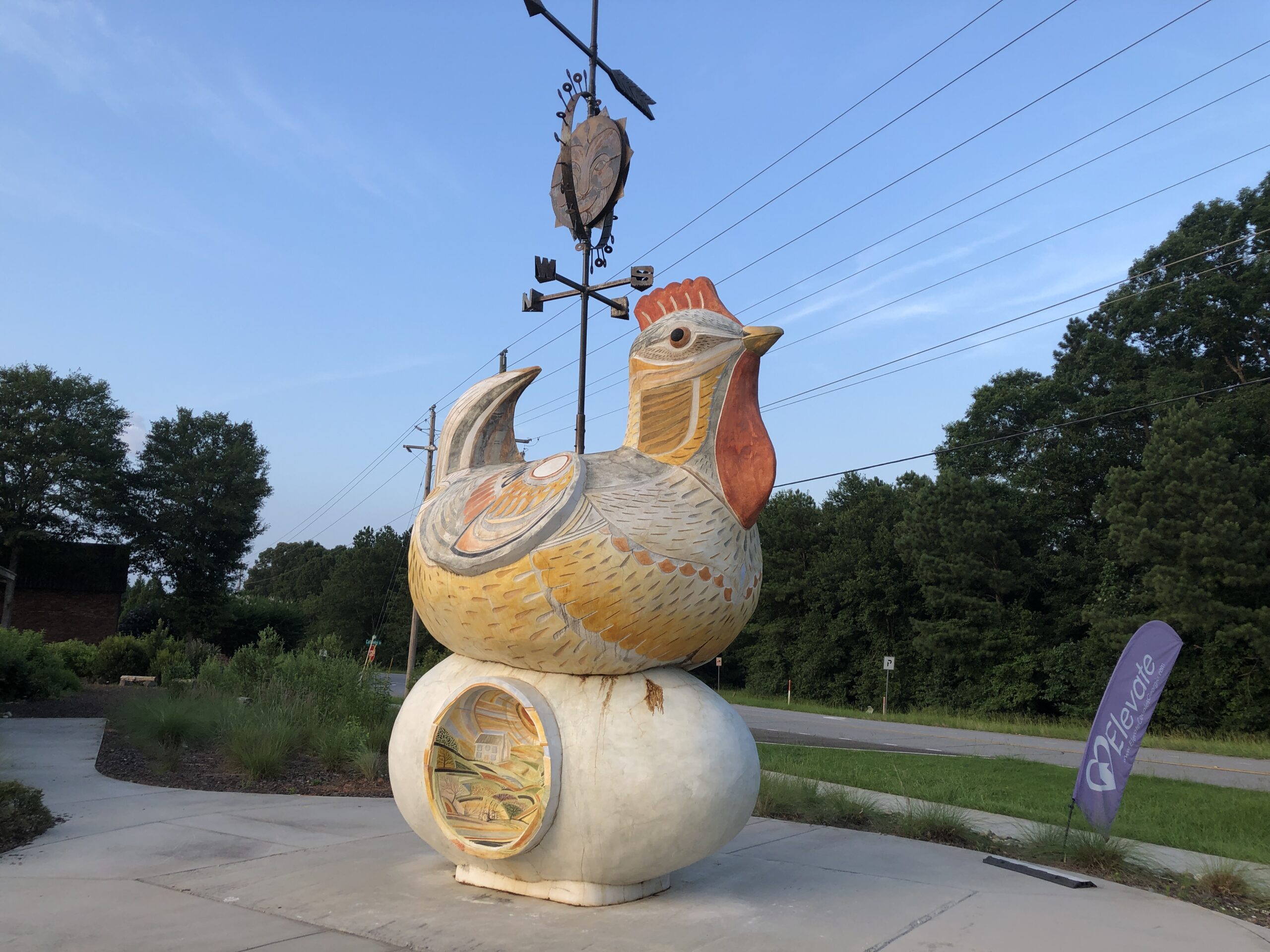 Sometimes you’re driving along, minding your own business because your business at that moment is driving, and you see a two-story chicken near the road. Three stories if you count the iron weather vane perched atop the bird.