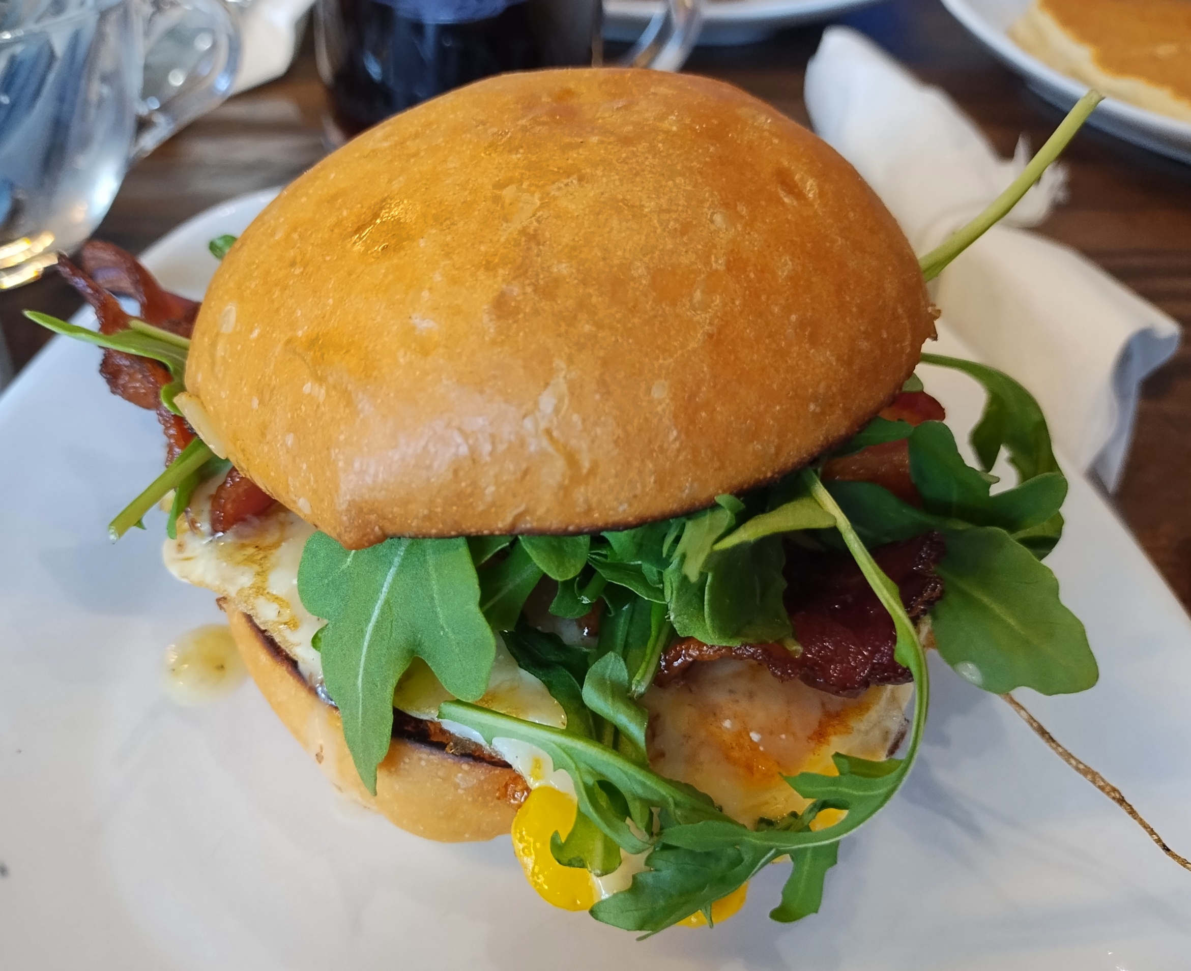 That, and really good food. I had the Whistler – “crispy sausage or bacon, sharp coastal cheddar, a fried egg & lemony-dressed arugula on a homemade bun,” the menu said. With a side of grits.