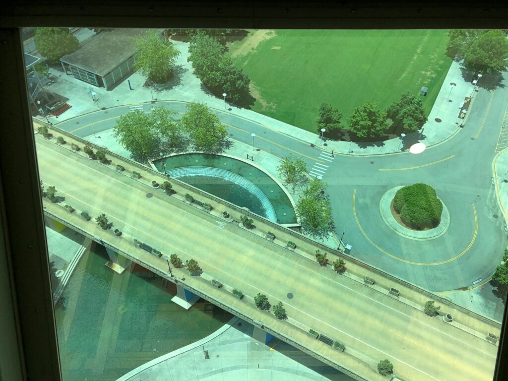 I’m glad to report that the interior of the Sunsphere is climate controlled. Also, admission is $10. If by magic the Sunsphere could relocate to any of the much larger U.S. metros, base admission might be three times that much, with a skip-the-line option for an extra fee. The structure is part of Knoxville’s World’s Fair Park, and I’d like to think that park authorities are holding the line on tourist inflation, but I’m sure it’s just what the market will bear.