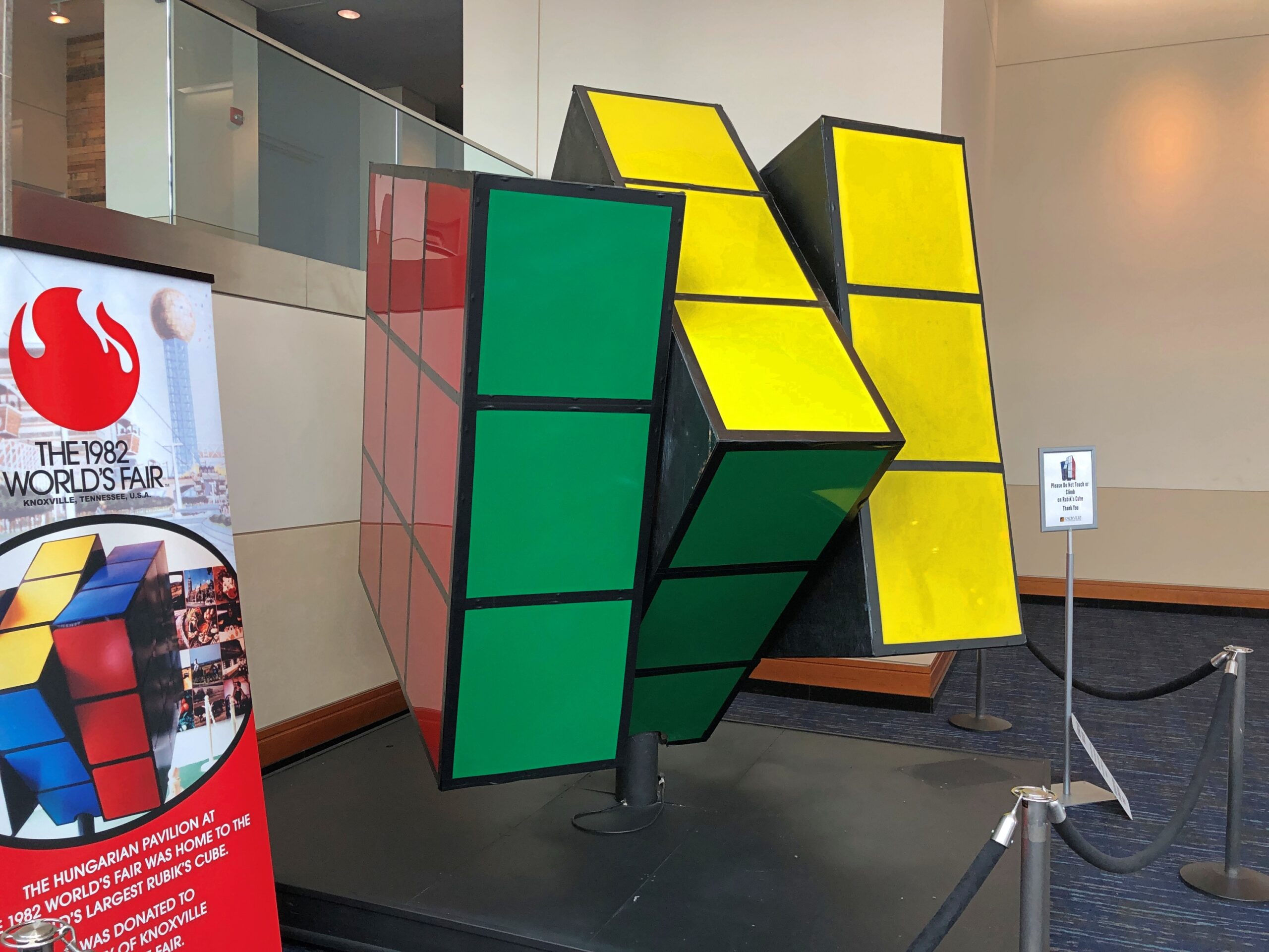 Once you’ve seen enough of the vista from the sphere, back on ground level the Knoxville Convention Center, developed on the former site of the U.S. Pavilion next to the tower, is open and showing the World’s Largest Rubik’s Cube. It used to grace the Hungarian Pavilion. I had to look it up: Rubik is still alive at 81, living in Budapest.
