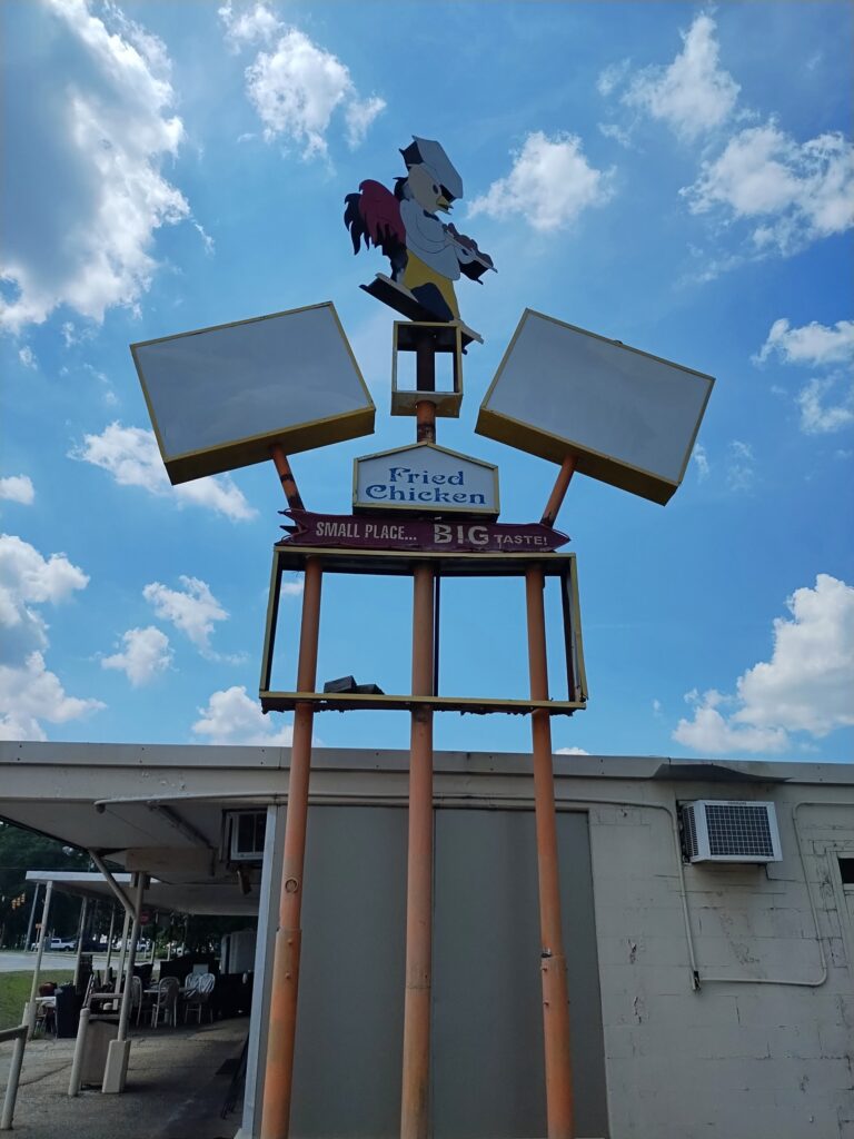 I’d happened on a Southern chicken joint, true to that tradition, take out only, and during the few minutes I waited for my order as people came and went — for it was a popular place — I noted I was the palest customer. I ordered a box of chicken livers and fries that I ate partly in a nearby park, and partly in my room that evening. Mildly spiced and well fried, the boxed livers reminded me of the satisfying livers that a Chicago-area Harold’s Chicken would serve. Korner Shack sold me one of the best meals of the trip.
