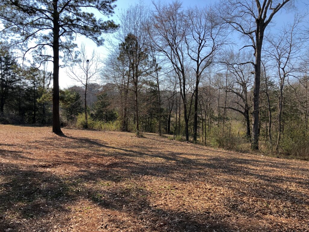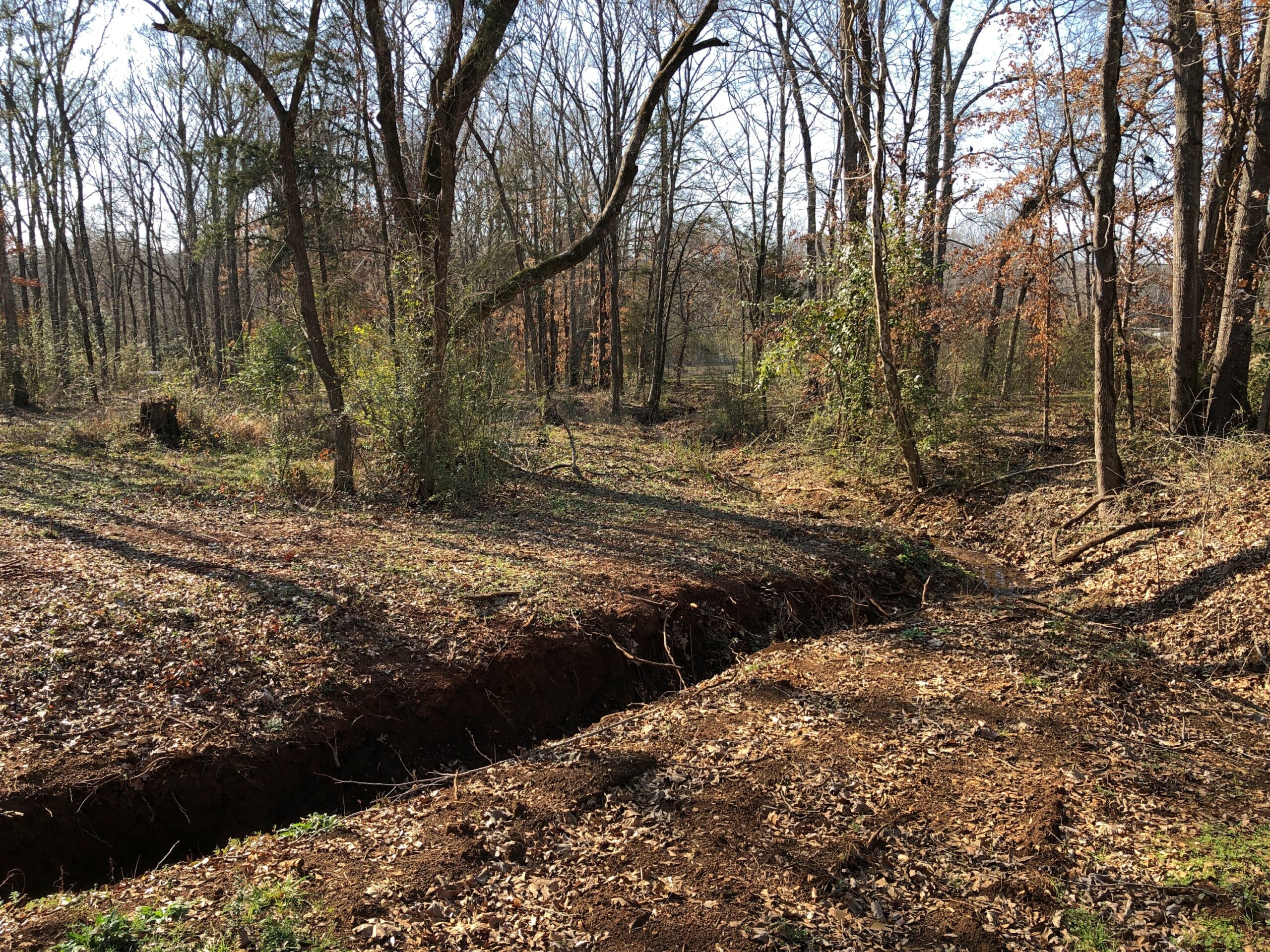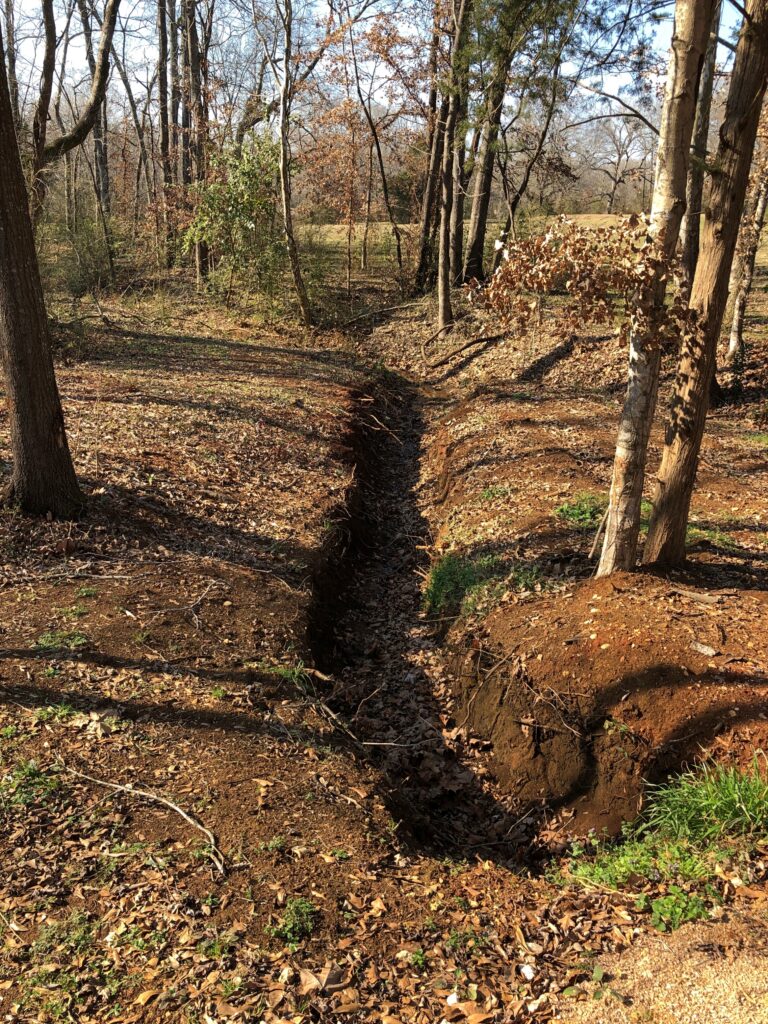 Gashes in the earth run through the wooded grounds.