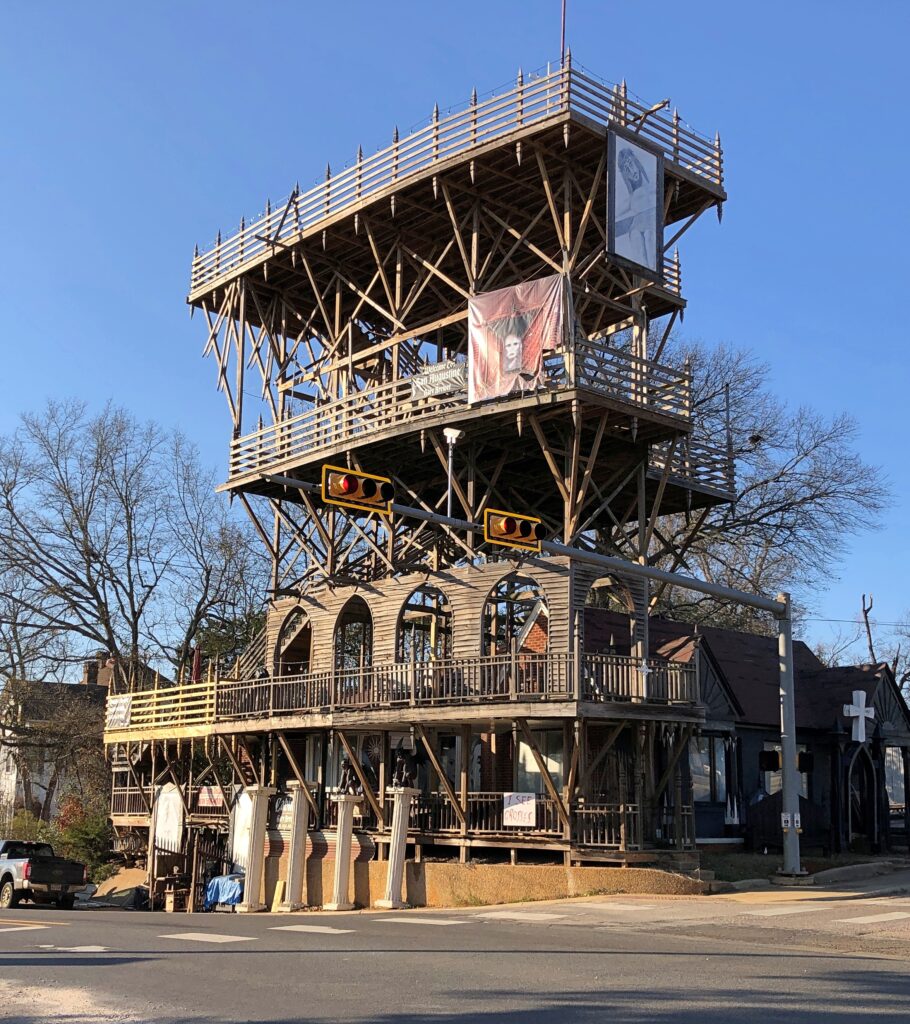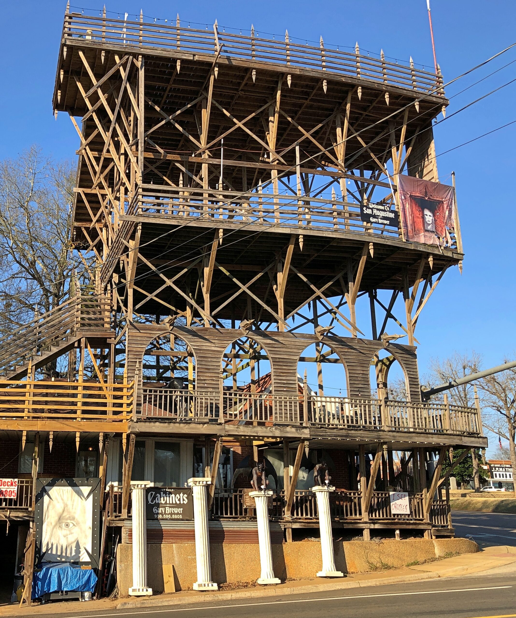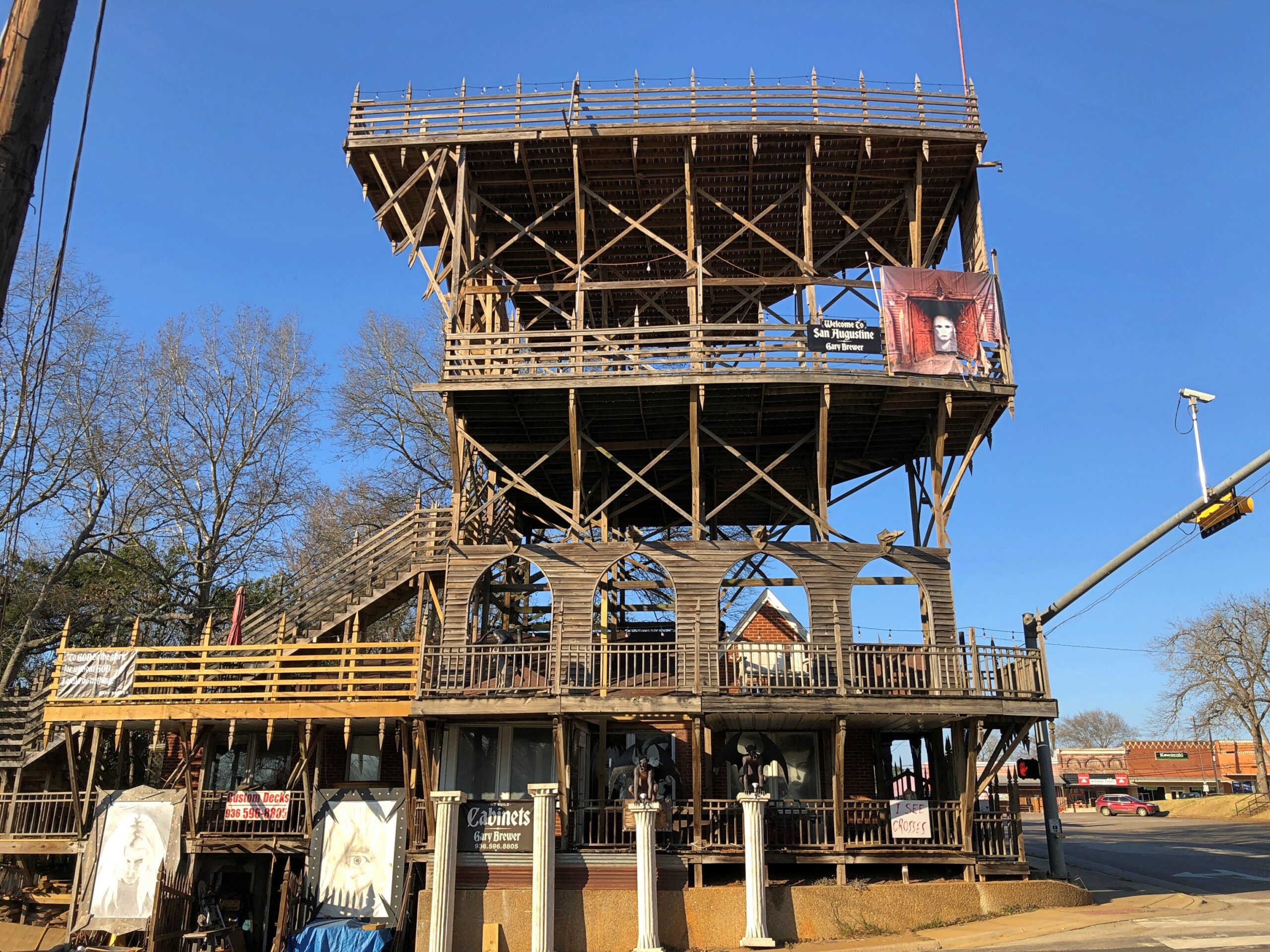 Roadside America calls it “Major Fun,” and I will say it was a major surprise, since I went to San Augustine knowing very little about the place. RA says: “Gary Brewer, a carpenter, has been adding multi-story decks and spiky wooden things to the outside of his house since 2006. The town has tried to stop him, but the woodwork is all code-compliant. Gary views his house an attraction, and wants people to visit it.”
